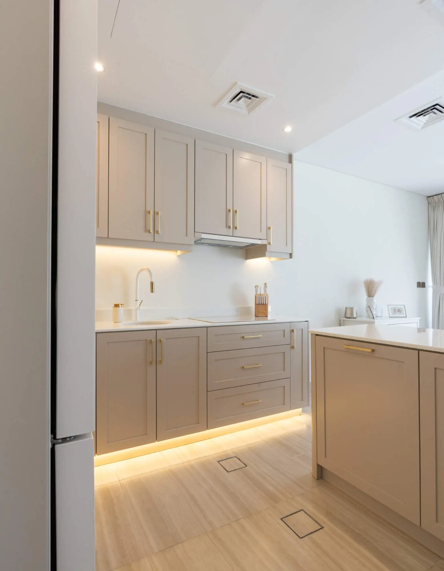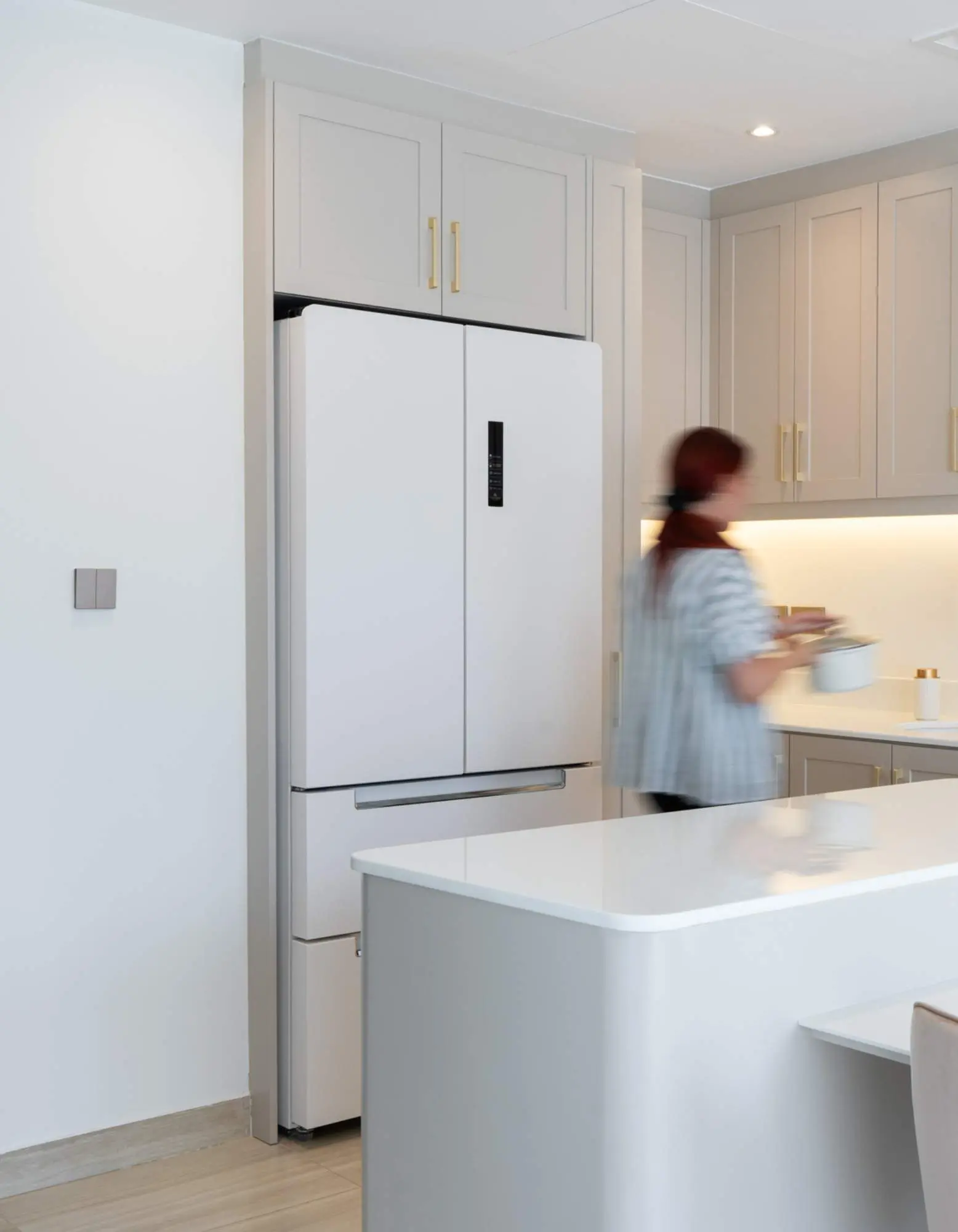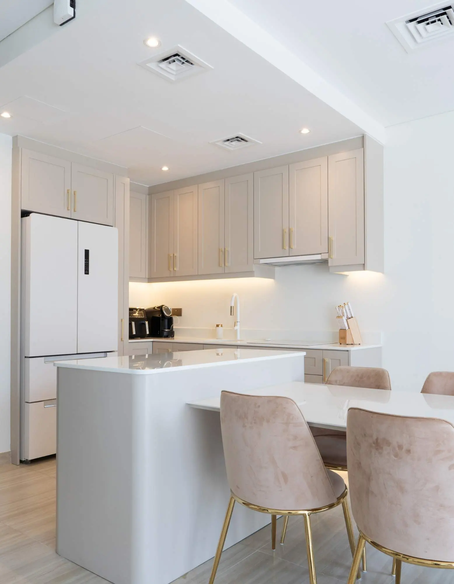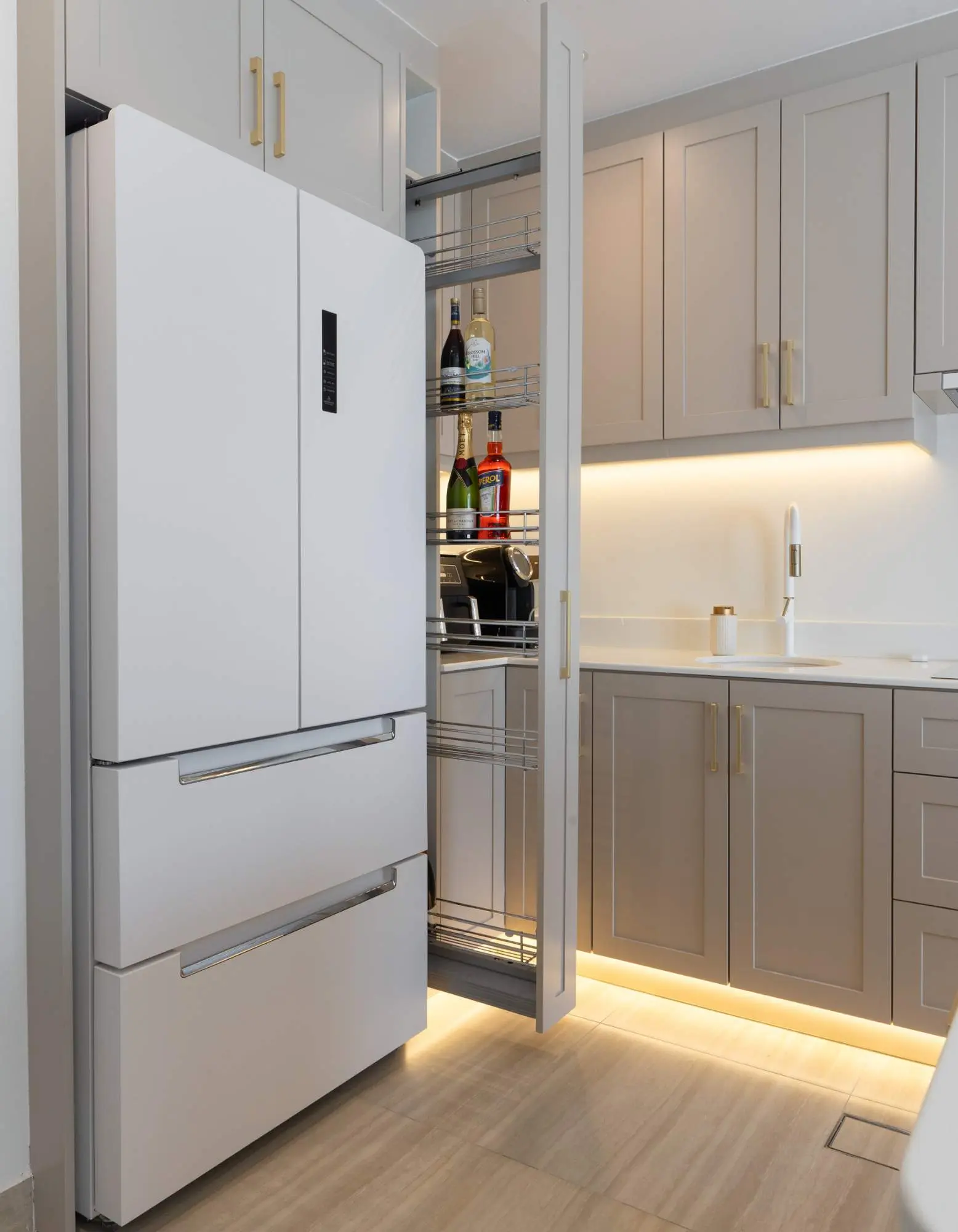 Collaborating with top-notch joiners, we ensured impeccable craftsmanship in every detail of this kitchen. To add a touch of luxury, we sourced neolith countertops and white fixtures and fittings. The fridge was wrapped to match the space.