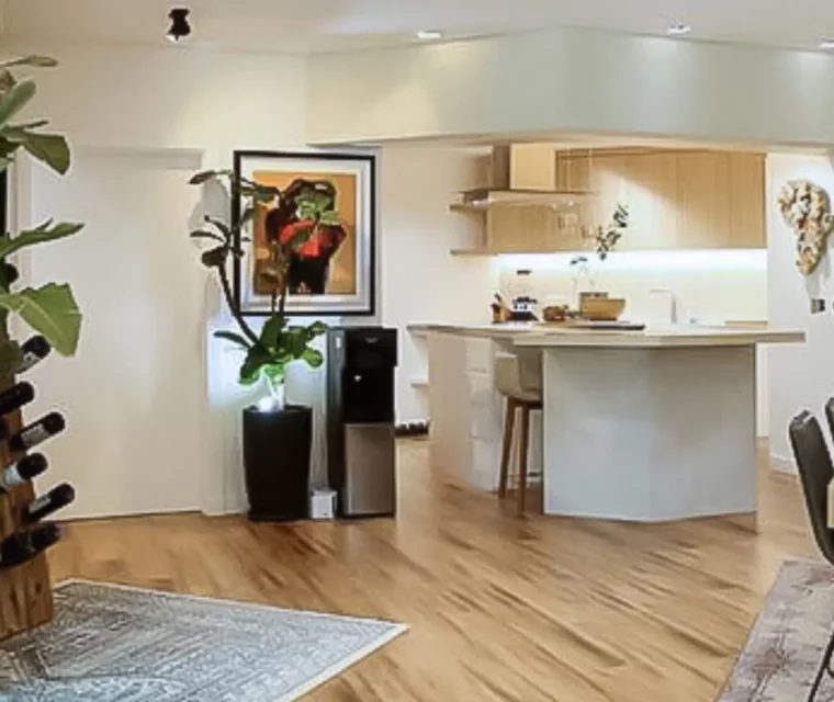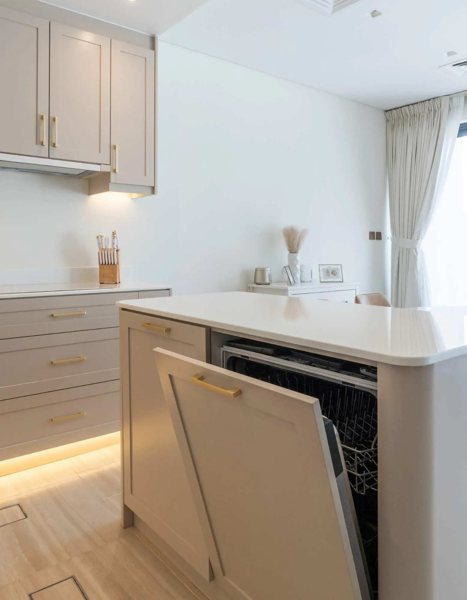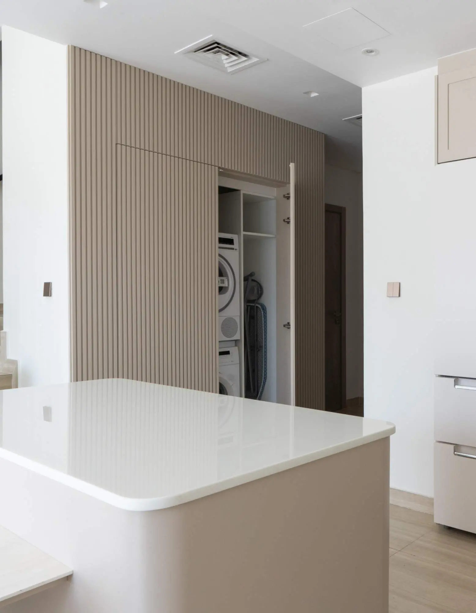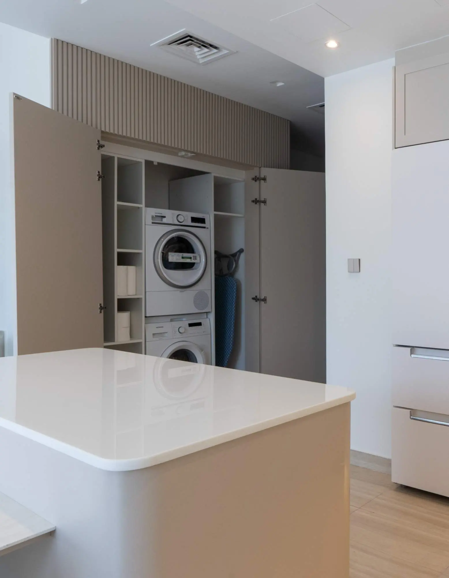 Collaborating with top-notch joiners, we ensured impeccable craftsmanship in every detail of this kitchen. To add a touch of luxury, we sourced neolith countertops and white fixtures and fittings. The fridge was wrapped to match the space.