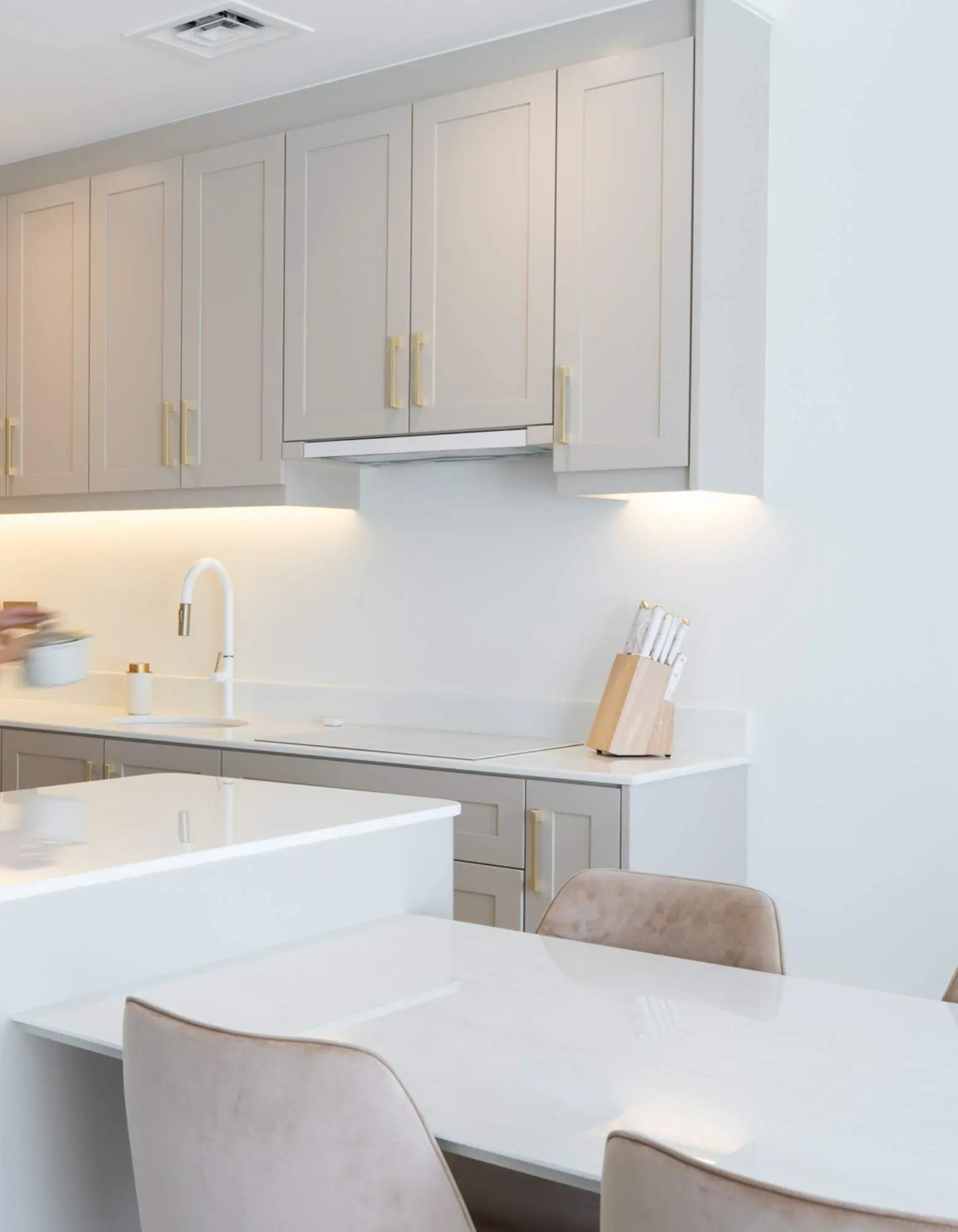 For this kitchen renovation project, we achieved a luxurious, feminine ambiance. Our clever storage solutions and light color palette added a sense of spaciousness to what was a small dark space. Custom joinery and countertops add to the luxe feel. We are obsessed!